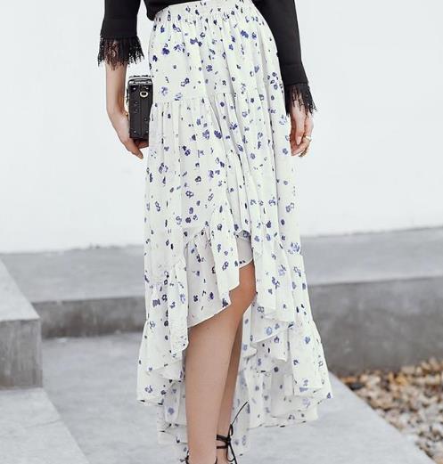 白底碎花面料的半身裙,采用了松紧带的腰部设计,非常的舒适不勒腰,不规则的裙摆设计,穿起来特别的飘逸。