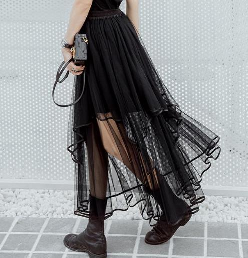 黑色双层网纱面料制作而成的半身裙,采用了不规则的裙摆设计,非常的轻柔飘逸,穿起来能尽显你性感的腰身。