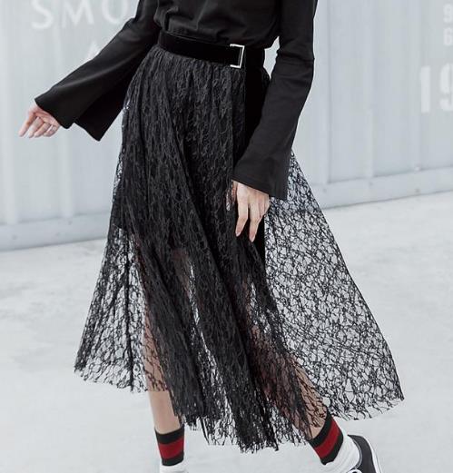 气场女王最爱穿的黑色蕾丝网纱裙黑色的蕾丝网纱面料制作的半身裙,黑色蕾丝网纱裙采用了百褶裙的款式设计,黑色蕾丝网纱裙搭配上任何的衣物穿起来,黑色蕾丝网纱裙的搭配都能够突显出你优雅的气质。