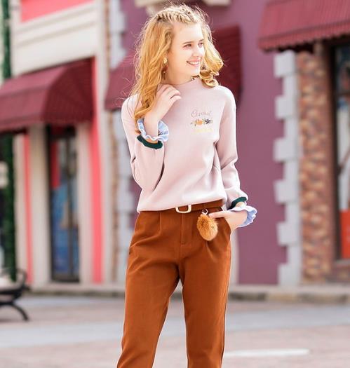浅浅的淡茱萸粉,褪去少女的稚嫩与天真,多了几分轻熟与知性;不过,每个年龄段的女人内心都会有一个小可爱,精巧的刺绣和卷卷的木耳边是最好的诠释,搭配超级流行的焦糖色裤子,无形中增添几分干练。
