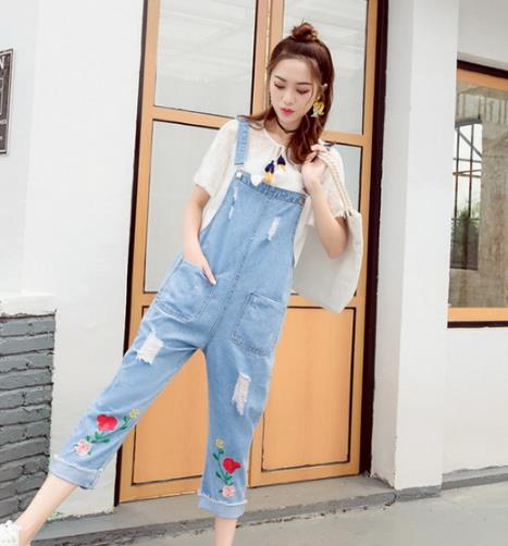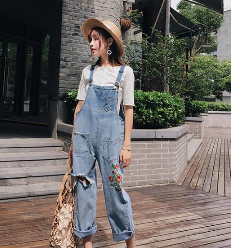 刺绣破洞牛仔背带裤。俏皮减龄的背带裤哪有小仙女不喜欢,超级精致的刺绣花朵,大方优雅的卷边裤脚,不管是约会还是出去玩,都能hold住全场,尽显撩人的魅力。