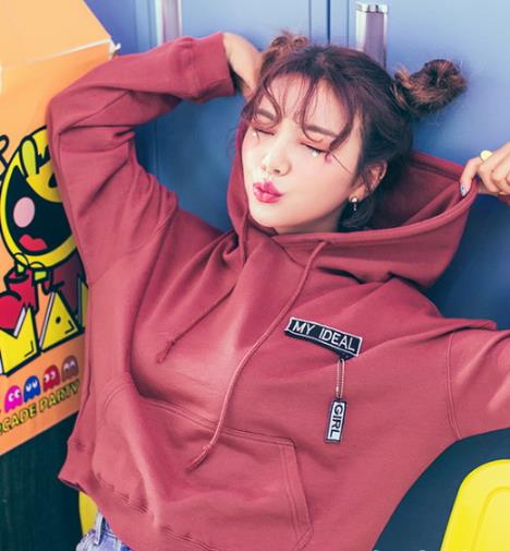 宽松连帽短款卫衣。 很适合小个子的一款卫衣。短款的衣身长度,搭配高腰下装,尤其显得腿长。而且宽松的版型搭配落肩袖设计,上身还很能遮肉,效果一级棒。