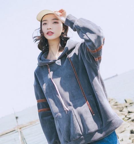连帽抽绳丝绒卫衣。 这件卫衣走的原宿风路线。衣袖上的撞色拼接和飘带相呼应,很协调。金丝绒的面料,宽松的版型,不仅上身遮肉显瘦,而且还很温暖,不受冻。