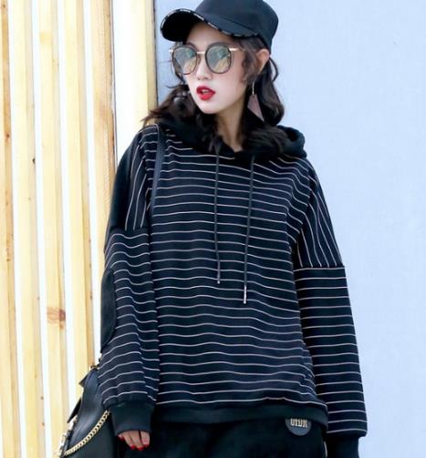 加厚金丝绒拼接卫衣。 比较显瘦的一件卫衣。衣身采用了经典的条纹元素,时尚不过时。而且宽松的版型,经典的连帽,简单大方,搭配什么下装都很有时髦范。