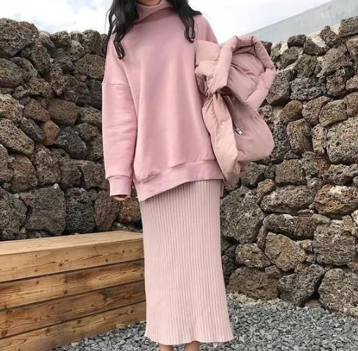 甜美的粉色系,和粉色唯一的搭配的时候看着就像半身裙一样,长度快要脚踝,保暖又温柔。