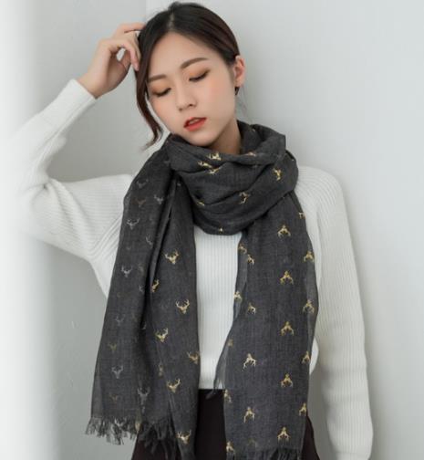 小鹿烫金棉麻保暖围巾。在南方,有时冬天还不至于太冷,你可以选择棉麻材质的围巾。不要小看棉麻的保暖能力,一层层围起来总是能抗寒的。烫金小鹿在深灰底色映衬下十分文艺出彩,好看!