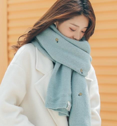 可爱针织菠萝毛线围巾。毛线围巾十分厚重,同时也更为保暖。怕在冬天会冻着脖子的小仙女可以选择这样一条毛线围巾。浅绿色清新自然,小菠萝图案刺绣别致可爱,戴起来萌萌哒。