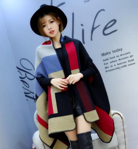 撞色仿羊绒斗篷披肩。这件斗篷披肩因为多了两个袖口,穿起来不容易掉落。正红色、天蓝色、黑色、驼色的撞色设计消解了冬天的沉闷,即使你的内搭不够出彩,只要有这件斗篷披肩,一下子就时尚起来。