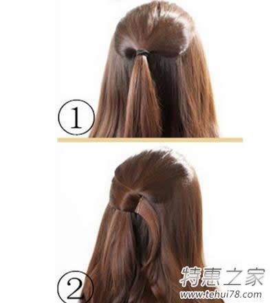 ②均匀在马尾的两侧分出两股头发,左侧头发跟马尾交叉,然后用发夹固定。