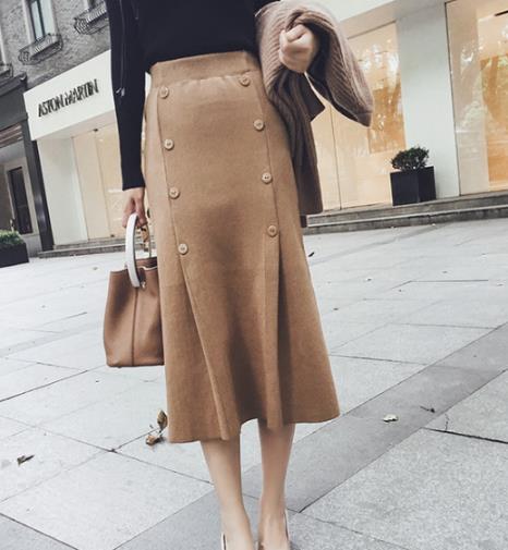 高腰针织半身裙。日常气质百搭的半身裙,有点小鱼尾裙的版型。还使用了同色的纽扣做装饰,很显气质的哦——百褶也是很讲究的,才达到了这样的效果。