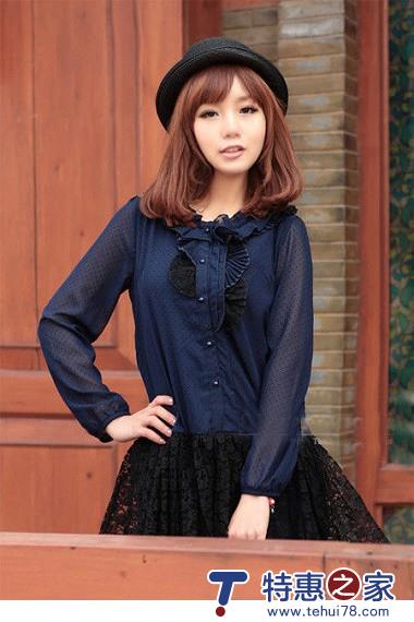 07 藏青色小圆点宫廷衬衫相当另类,胸前的扇形花边别致又精巧,与下身带有褶皱设计的蕾丝短裙拼接无论从颜色上还是款式上来看,都是非常值得“收”入的一款单品呢~