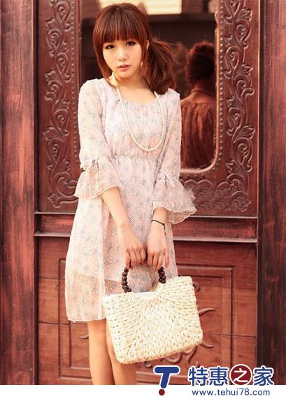 02 典型的日系甜美装,浅浅的碎花纱衣容易令人提升好感度,在腰身和袖口的松紧带添加能够恰好地勾勒出MM的娇巧身型,草编手提包帮助营造出温馨怡人的居家气息。