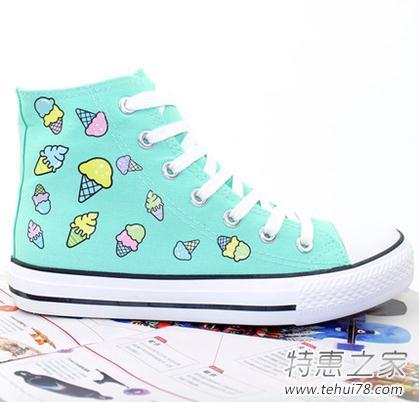 充满了夏日清新味的一款高帮系带帆布鞋,鞋面上各种颜色的冰淇淋,看着就特别的心情开朗呢~
