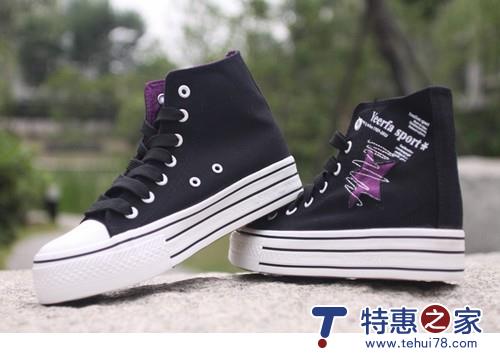 03 纯色高帮帆布鞋同样具有极高的实用度,松糕底的加入又增强了整体的流行度。黑紫配色沉稳大气,百搭又耐脏。经典五角星图案和英文字母相结合的印花,简洁利落。