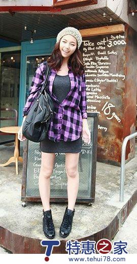 05 休闲随意的格子立领衬衫,紫色与黑色的格子配色很漂亮,给人甜美的感觉。胸口处两个口袋为你添加可爱气息。