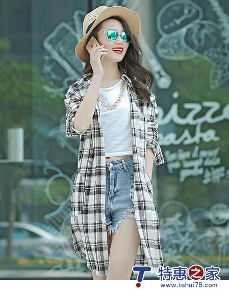 03 善于搭配的姑娘还能将OVERSIZE衬衫穿出别的花样。格子图案经典百搭,与宽松尺寸联袂,一件可以夏天穿着、帅气时尚又能防晒的风衣便华丽丽诞生,内里简约清爽的T恤+牛仔与它简直天造地设一对。