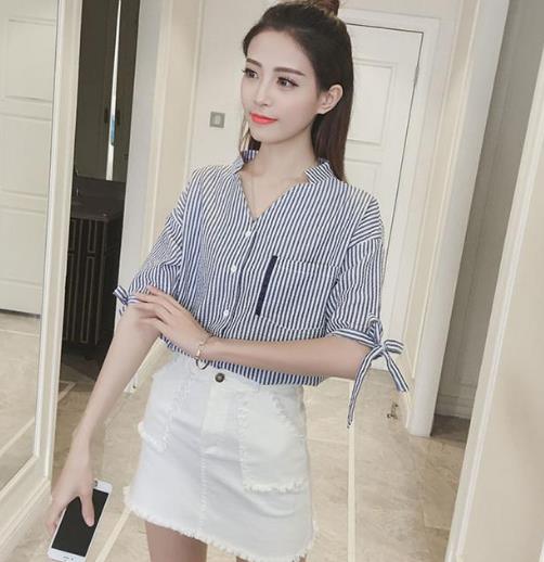 色织泡泡纱面料清凉透气,经典条纹设计简单时尚,蝴蝶结袖口甜美可爱,经典V领展现迷人锁骨。