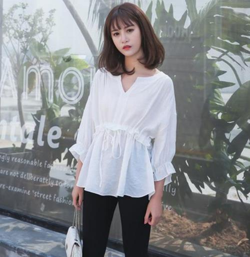 抽绳系带设计收腰显瘦,五分灯笼袖修饰手臂线条,V领设计勾勒颈部线条,优质棉麻面料亲肤舒适。