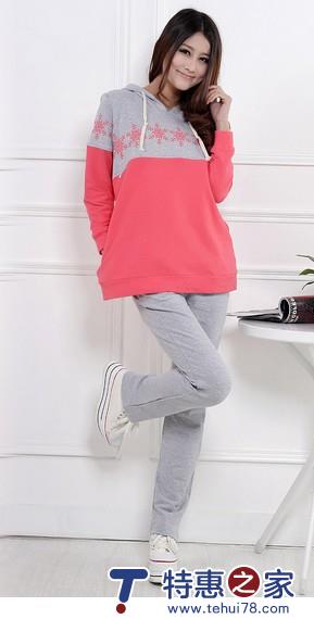 06 还是纯棉的面料,套装的设计,省却搭配烦恼。连帽休闲感十足,走的是轻松自在的运动风格,小编就时常在街头看到穿这种套装的准妈咪,回头率挺高。色彩上灰色与粉红拼接,有两种款式,变化的是色彩的位置。长袖的设计,春秋冬皆宜,产前产后也都可以穿。