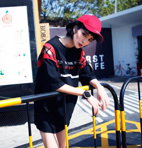 港风个性圆领短袖T恤裙,在原本简单的T上,加入了绑带的元素本来就显得眼前一亮。设计的部位我选择了在肩部的位置,这样使衣服时尚感又提升了不少。