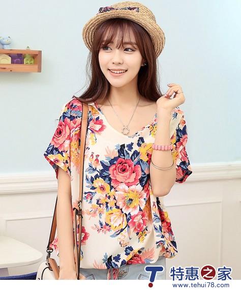 01 雪纺衫是街头巷尾大肆流行的款式。本款雪纺衫是宽松的,享受难得的自由滋味,V领削利的线条露得更多,也是性感的武器!印花在这里不再以细碎的碎花形式出现,而是大朵的绽放,带来花样的少女,浪漫清新。
