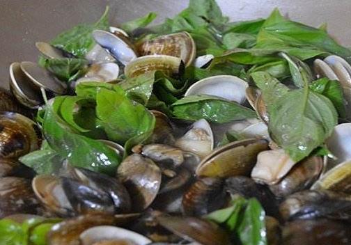 材料 : 九层塔、蛤蜊、百里香、生抽、糖、盐、醋、姜丝、蒜片。
