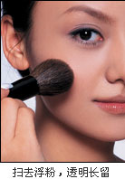 要创造完美的裸妆,摆脱脂粉气,最后用大粉刷以向外下的方向扫去残留在皮肤上的浮粉,露出自然的光泽。