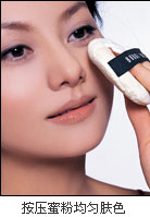 从遮瑕的眼下开始,避开上眼睑,从脸部中央向周围按压蜜粉定妆。会让全脸肤色更均匀,质感更自然。