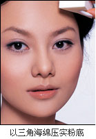 对于浮起的粉底,需以干燥的三角海绵轻轻滚压。千万不要拉蹭,以免破坏均匀度。