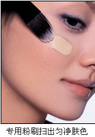 选一款和肤色接近,并含有保湿滋养成分的粉底,以大粉刷轻轻扫匀。刷毛应帖服于肌肤,能制造比手指更完美的妆效。