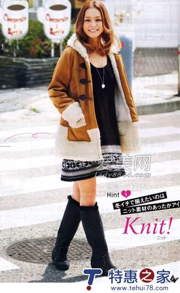 04 黑色印花连身裙搭配棕色羊羔绒外套,黑色长靴细节处的毛毛装饰增添了几分小女人的成熟,整身装扮尽显北欧民族风情!