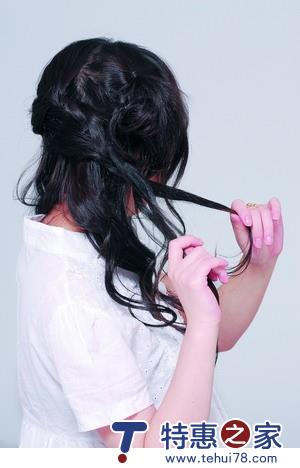 2.将编好的辫子在1/3处对折,用辫尾将头发紧紧地绕起来,然后用卡子固定。