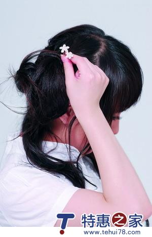 1.在头顶的一侧揪出一撮头发,分成大小两缕,用小的那缕绕在大的那缕上,然后用发卡固定。
