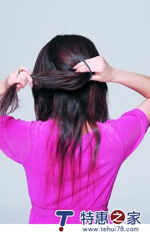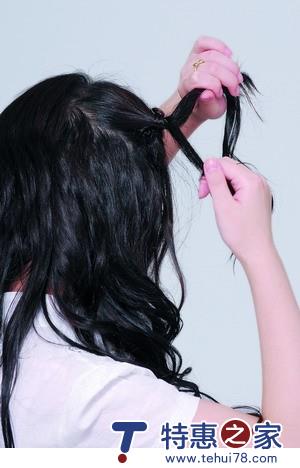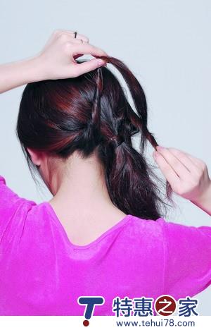 2.留出的头发,除了在耳后继续留出一缕,其余的如图分成两股,每一股都向里绕转,然后交叉缠绕在歪马尾扎皮筋的地方,把发梢儿塞到皮筋里固定。