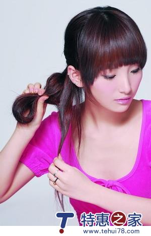 1.如图,用皮筋扎成歪马尾,周围一圈都要留出一些头发。