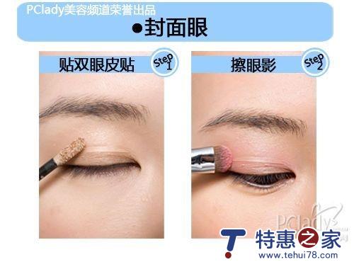 1 在原本摺痕的正上方,稍碰触眼褶边缘贴上双眼皮贴。再以肤色眼蜜或定妆底膏打底,淡化双眼皮的胶型。