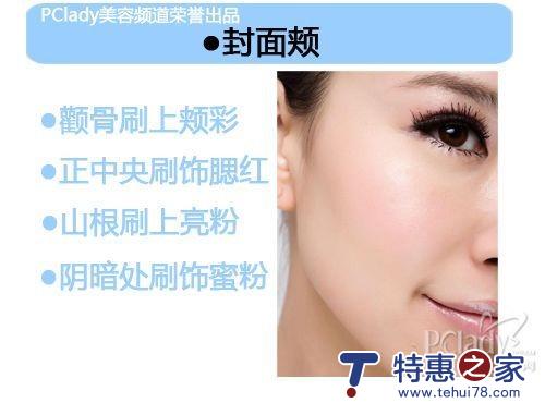 1 浅浅微笑找到颧骨最突出处刷上淡粉红颊彩,与底妆步骤时的霜状腮红相互融合,如同融化在肌肤上一般服贴。