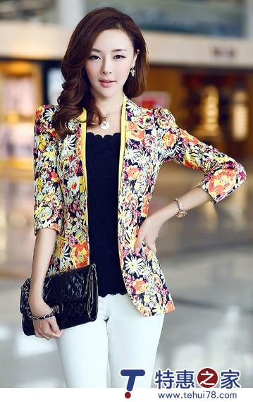 05 让西装领换个方式出场,既要有传统西装蕴含的端庄大气,又不失时尚变迁出的个性俏丽,选择小开叉时尚V型肯定不会错,黄色门襟拼接有如丝巾般映衬一粒暗扣的简洁,让印花修身浪漫到明星气十足。