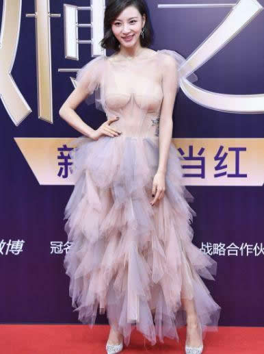 陈雅婷裸色长裙成功抢镜, 话题女王非她莫属, 女星看了很嫉妒!活动当日,只见她身穿一条特制的裸色长纱裙,这条纱裙十分与众不同,将陈雅婷的气质完全展现了出来。裙子采用了大胆的流云设计,下半身是蛋糕样的凌乱设计,长度接近脚踝,而上半身却采用了几近全裸的设计,上半身下半身形成了鲜明的对比,成为了一幅另类唯美的画面。