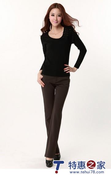 07 深咖色侧镶边微喇裤,是具有装饰的微喇裤,在深咖色裤子的侧面镶上一条深色的裤边,用宽宽的裤边代替了裤线,使得裤子看起来更为直线,增强了拉长腿部的效果。镶拼的设计,为面料裤子带来一丝变化,既显高又不同,一举两得。