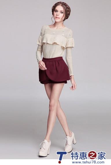 06 短款毛衣配半身裙的活泼造型很适合秋冬交替之际,将裙装换成裙裤则更实用,多风季节也不用担心遇到裙角被掀起的尴尬。立体的褶皱花边并没有从腰际开始,营造出鱼尾裙式的优雅妩媚。