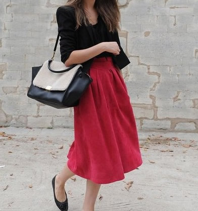 短打的黑色小西装外套,耸肩有型,配搭修身得体,内搭黑色的背心,下穿火红抢眼的长裙,让配搭每分每秒都靓丽无限。
