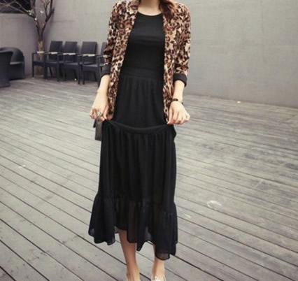 豹纹西装外套,帅气与野性的组合,成熟与优雅的展现,配搭黑色的雪纺长裙,让气质优雅充满了魅力无限。