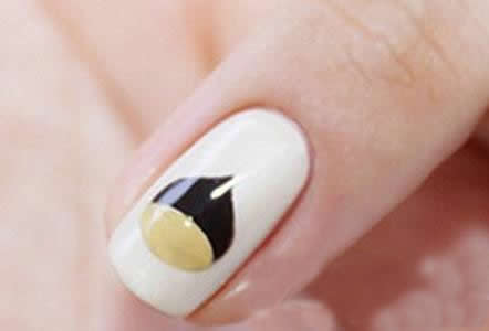 第三步:用勾线笔沾取黑色甲油,在白色甲面上画出黑色水滴形,接着在水滴前缘画出黄色的半圆,如图,照干60秒。