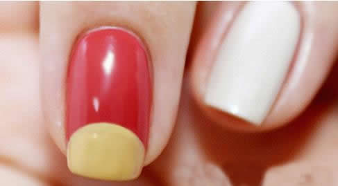第二步:在红色甲面前缘刷上半圆的法式甲,如图,照干60秒。