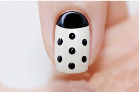 第四步:在白色甲面后缘画出黑色的法式,接着用点钻笔沾取黑色甲油,点出圆点装饰,如图,照干60秒。