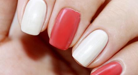 第一步:准备好所需的甲油和工具,刷上底油,照干60秒。然后整甲刷上白色和红色,如图,照干60秒。