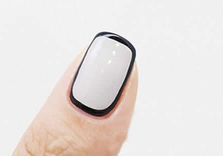 第五步:整甲刷上灰色甲油,然后用勾线笔沾取黑色甲油,为甲面包边,如图,照干60秒。