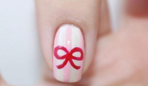 第八步:用点钻笔沾取红色甲油在指甲中间点出蝴蝶结的中心,接着用勾线笔沾取红色甲油画出蝴蝶结,如图,照灯60秒。