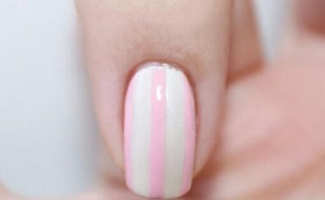 第七步:沾取粉色甲油在食指中间和两侧画出粉色条纹,如图,照灯60秒。